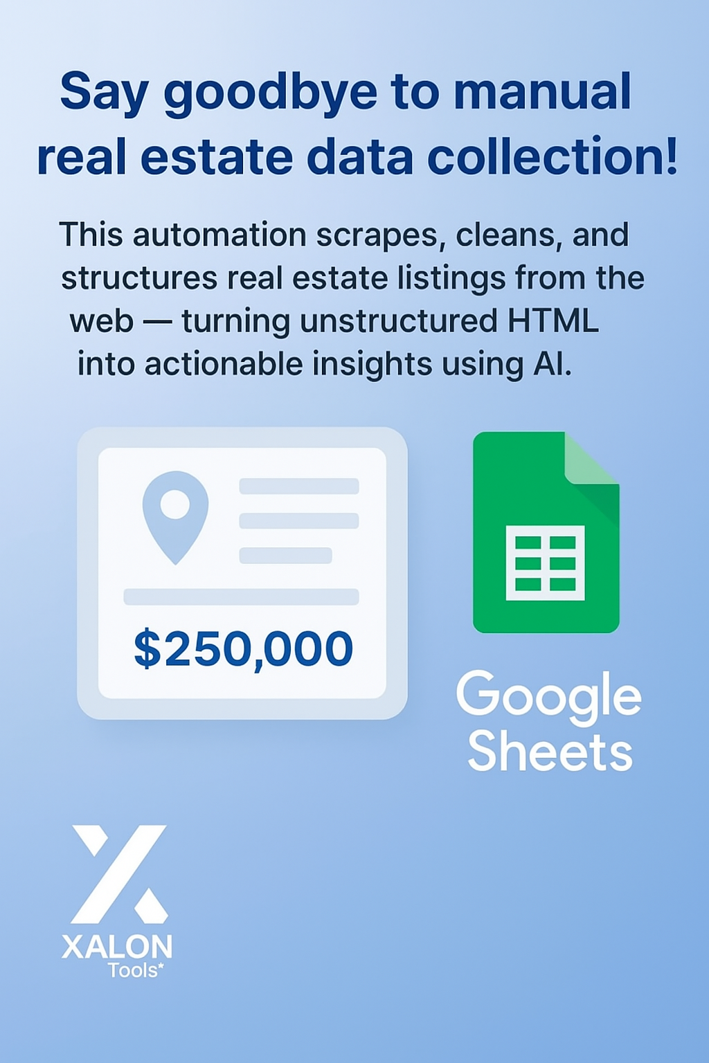 This automation scrapes, cleans, and structures real estate listings from the web — turning unstructured HTML into actionable insights using AI. Whether you're an analyst, investor, or proptech startup, this tool helps you collect accurate listing data at scale, bypass bot protection, and send results directly to Google Sheets, webhooks, or local storage.