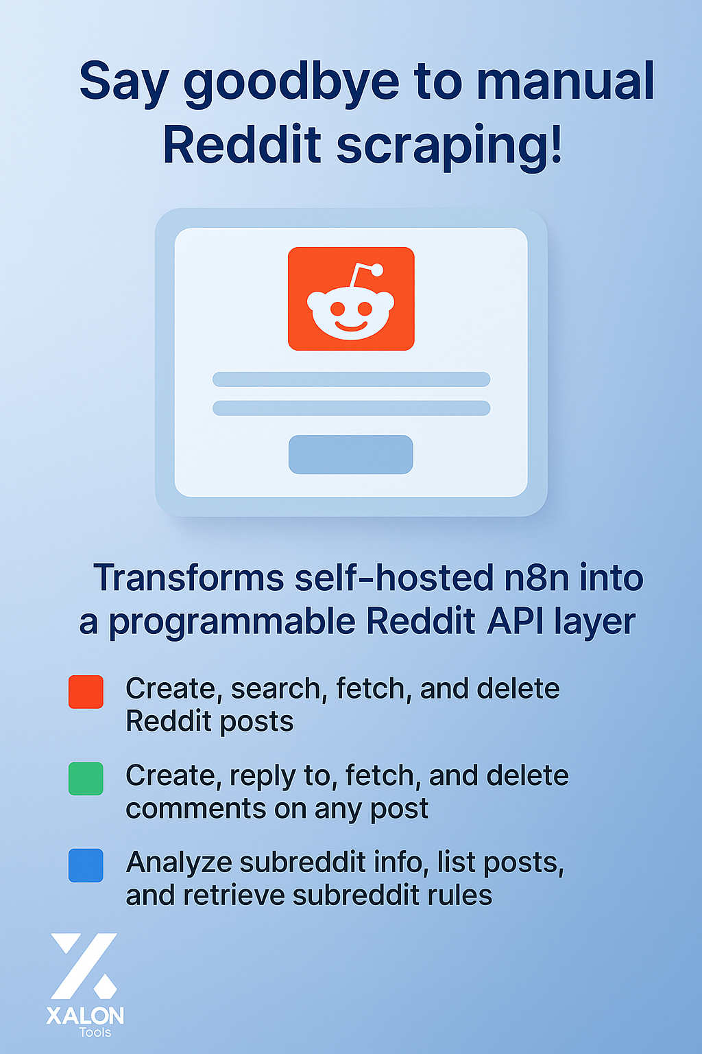 This automation transforms your self-hosted n8n into a programmable Reddit API layer — powered by a custom MCP Server over Server-Sent Events (SSE). It gives you full control over Reddit posts, comments, and metadata, enabling advanced workflows and AI agent integrations.