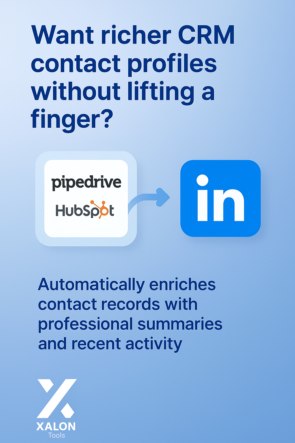 This automation connects your Pipedrive or HubSpot CRM to LinkedIn, automatically enriching contact records with professional summaries and recent activity. Powered by AI, it finds LinkedIn profiles that match your contacts and fills in valuable context — from job history to post highlights.