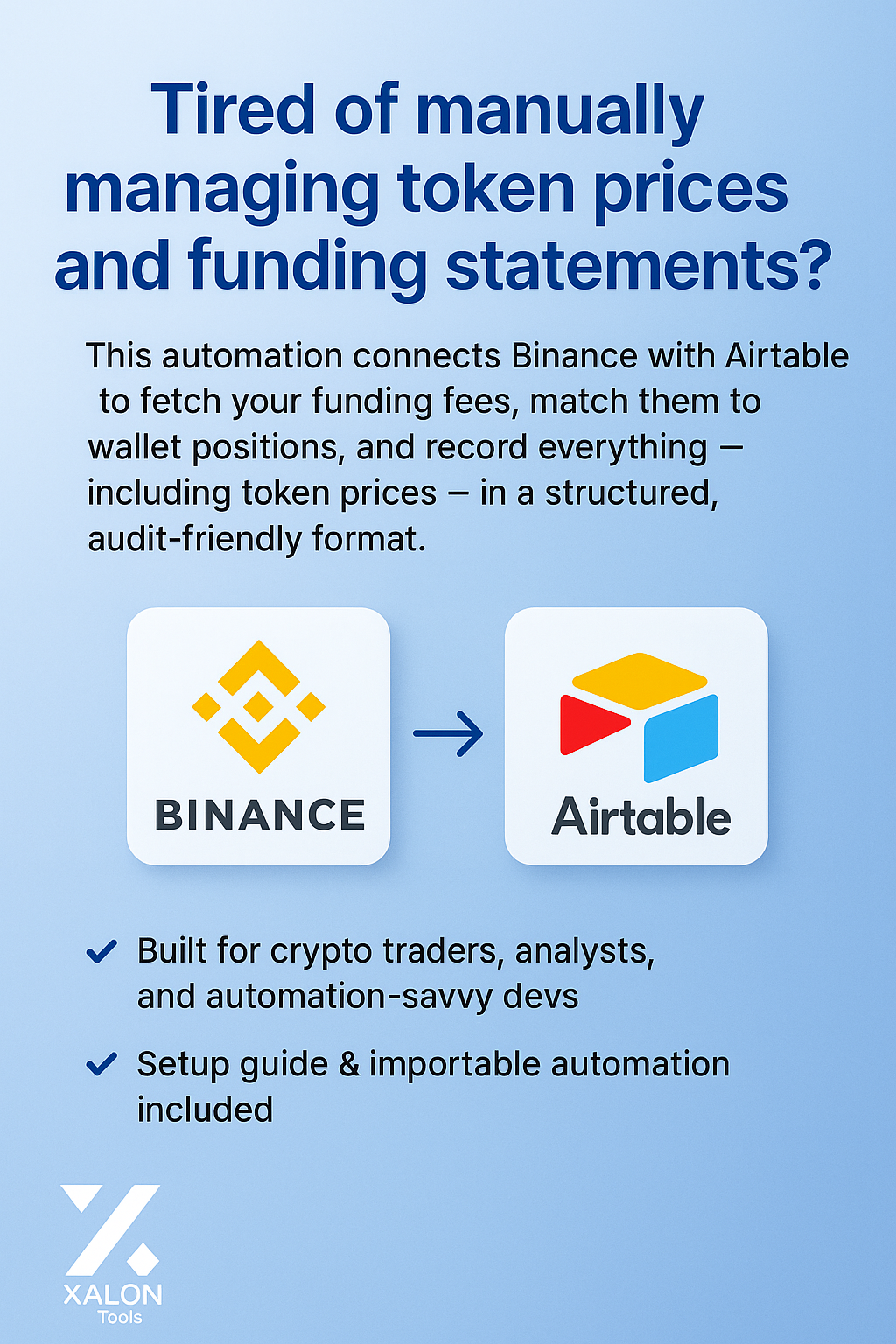 This automation connects Binance with Airtable to fetch your funding fees, match them to wallet positions, and record everything — including token prices — in a structured, audit-friendly format. Ideal for crypto analysts, devs, and DeFi power users who want clean records without the spreadsheet struggle.