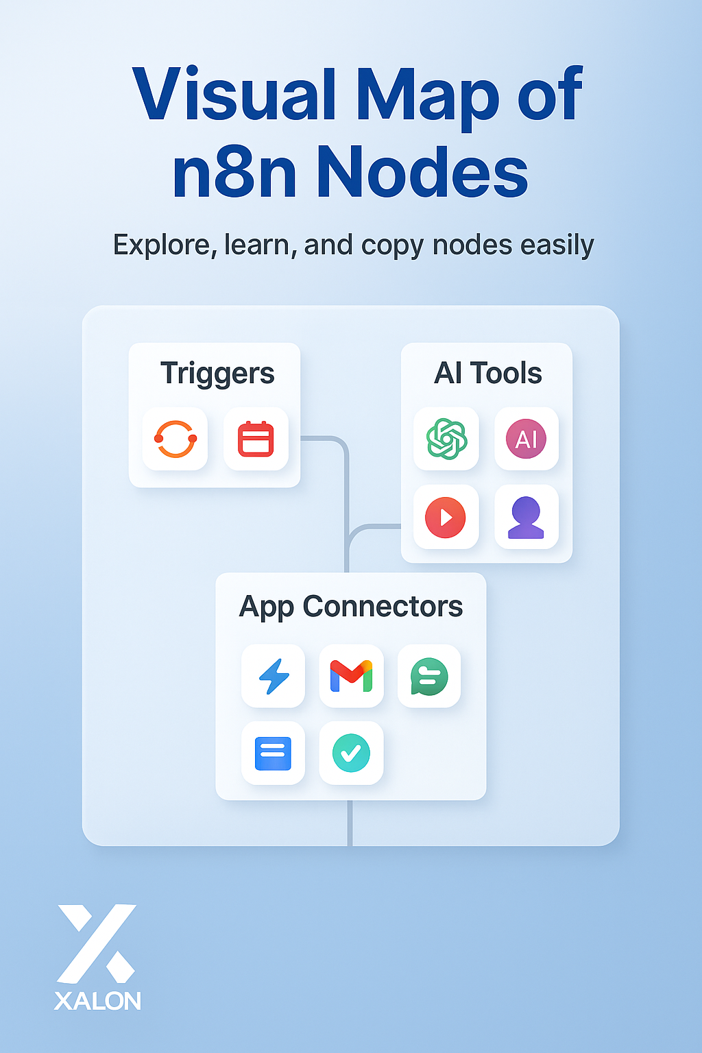 This visual map organizes essential n8n nodes—like Triggers, AI tools, and App connectors—right on the canvas, making it easy to explore, learn, and copy them into your own workflows. It’s your quick-reference guide to building better automations faster.