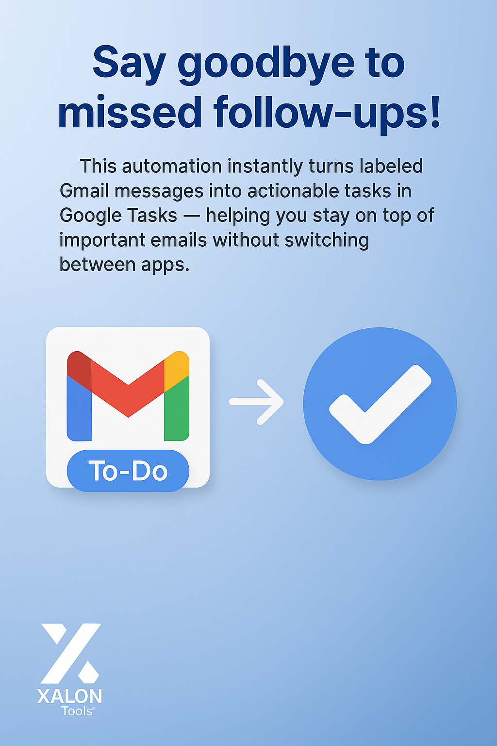 This automation instantly turns labeled Gmail messages into actionable tasks in Google Tasks — helping you stay on top of important emails without switching between apps.